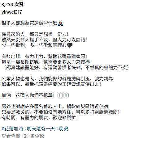 針對此次災情,林吟蔚在文中感性寫下,「公眾人物也是人,我們能做的就是拋磚引玉、親力親為」,如果可以的話,也要盡量將災區的正確資訊傳遞出去。最後,林吟蔚也向正在重建家園的居民溫馨喊話,「加油!花蓮人你們不孤單」。