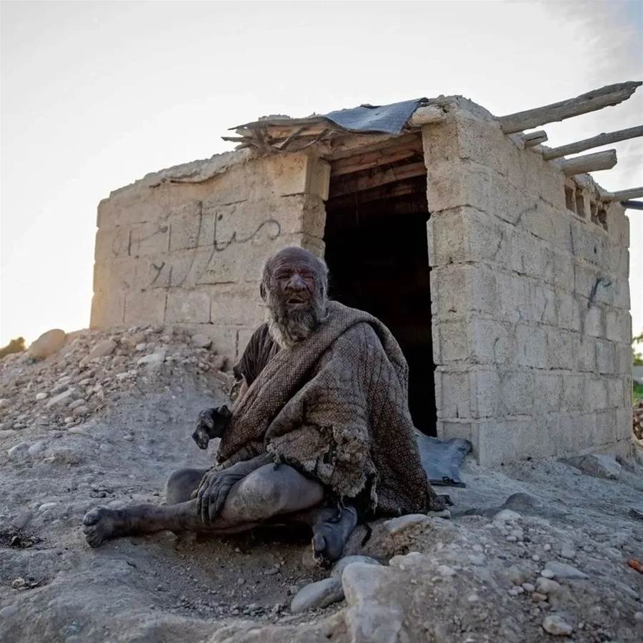 這位老人名叫阿穆·哈吉,生活在伊朗南部法爾斯省德傑加村,村子地處沙漠邊緣,環境惡劣,風沙大、降水少。 老人一生孤苦,住的是不足幾平方公尺的煤渣磚棚屋,沒有門窗、不通水電,四面堆滿磚石泥土,條件簡陋到極致。 他的模樣,重新整理了所有人對「髒」的認知。