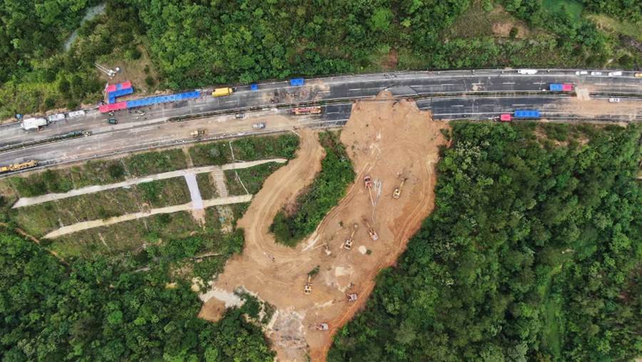 報告提到,災害發生前,廣東省出現多輪強降水過程,全省平均雨量破歷史同期紀錄。災害點路段為「倒三角形」溝谷地貌斜坡路堤,受長時間持續性降水影響,地下水持續累積、水位升高,暫態性地下水動靜水壓力、浮力和滲透力持續增大,滑動推力不斷積聚,長時間飽水造成路堤底部及基底軟化,抗剪強度降低,路堤中下部及擋土牆突然滑動變形,引發路堤上部填土塌方,造成高速公路塌方災害。