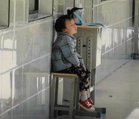 空蕩蕩的樓道裡沒有玩具,沒有動畫片,只有一把沒有靠背的小椅子,寶貝乖得讓人心疼。
