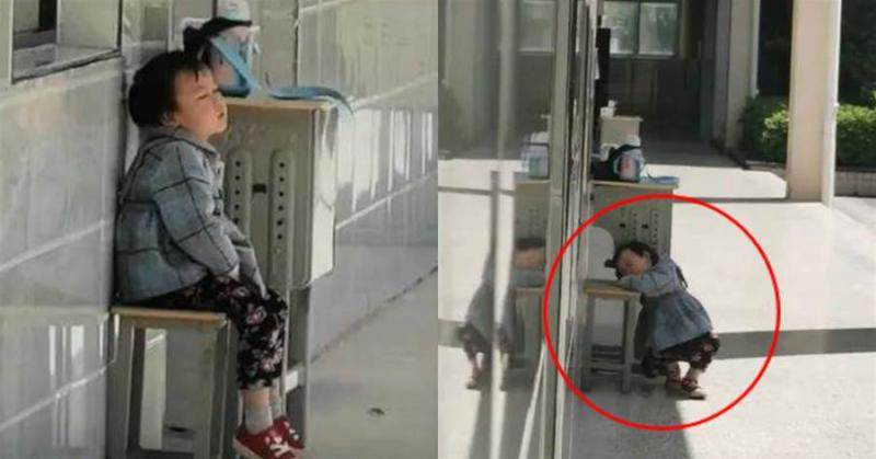 在視訊中,一個3歲大的小女孩在考場門口乖巧地坐著,