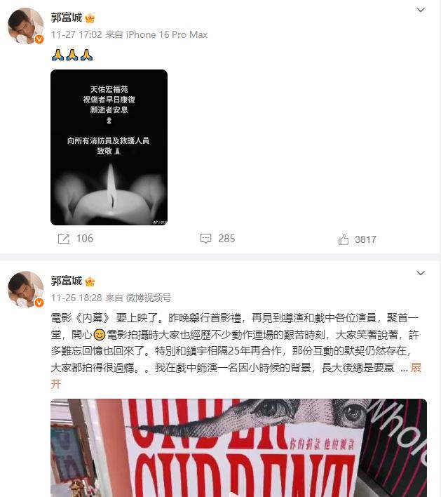 然而,火災發生後,郭富城立即在社交平臺上,向救援者致敬,也祝願遇難者能夠安息。