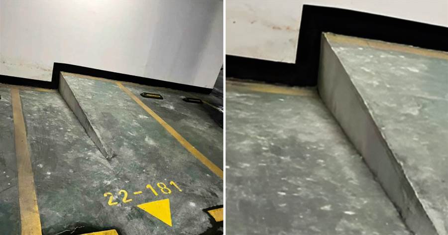那是一個靠牆的角落車位,地面上用鮮黃色標線清楚劃出停車范圍,但就在車位左側,一道明顯的高低落差橫亙其中,像個小小的斷層。從照片中可以看到,這個落差大約有十公分高,邊緣還有些微破損,看起來確實會造成停車困擾。