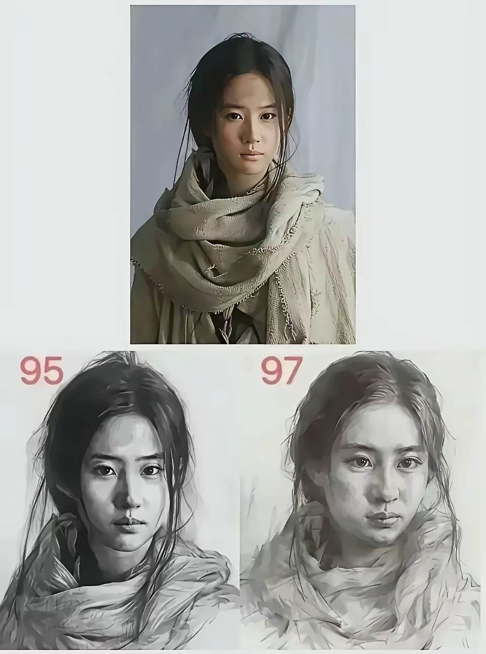 網友們對這兩幅畫的評價也各有側重。有人認為,95分的作品雖然在造型上更準確,但在明暗調的處理和線條的流暢性上有所欠缺,顯得有些匠氣,說明小侄女對素描的掌握還不夠精銳。而97分的作品雖然在造型上不夠準確,但在明暗調的處理上卻非常出彩,線條流暢而飄逸,展現了豐富的明暗關系和衣物的質感,顯示出作者對素描各要素的把握已經非常到位,未來的發展潛力巨大。