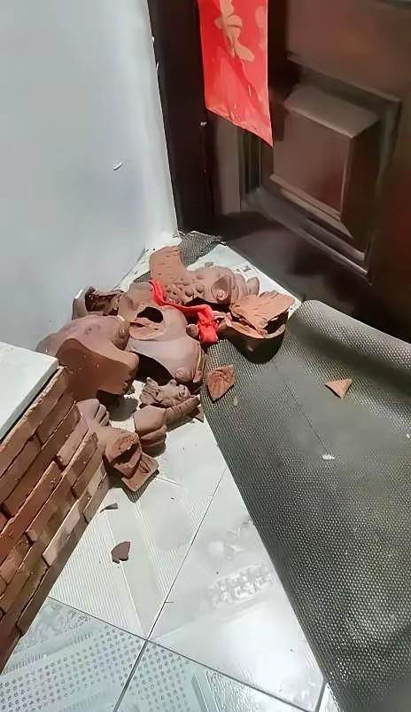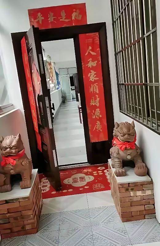 從現場照片可見,紅褐色的石獅子碎片散落在樓道地面,曾經威風凜凜的守護神如今只剩殘骸。而另一張照片顯示,在事發前這對石獅子端坐門側,頸系紅綢,與「平安是福」的春聯相映成趣,充滿傳統氣息。