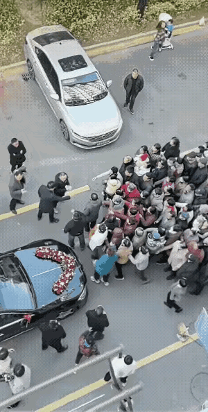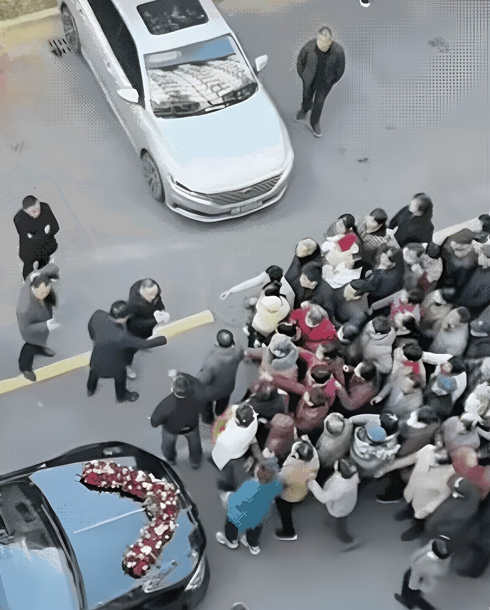 畫面中,穿著厚實冬裝的村民將婚車圍得水泄不通,場面一度陷入僵局。