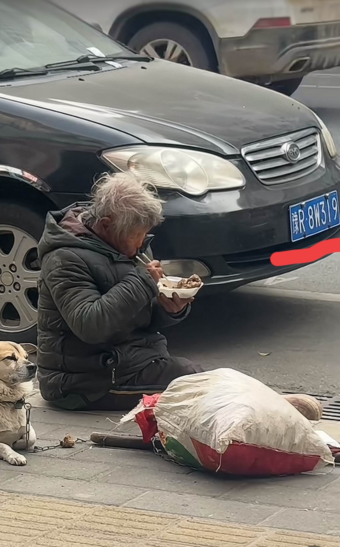 冬日的風帶著寒意。一位白髮蒼蒼的流浪老奶奶坐在人行道邊緣,專注地吃著一份簡單的食物。她的狗安靜地趴在身旁,粗糙的地面是臨時的餐桌。