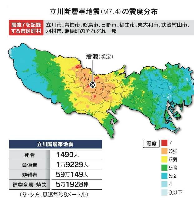 在東京都內,從青梅市經過立川市延伸至府中市,有一條名為立川斷層帶的活斷層。這條斷層帶被認為具有較高的地震活動潛力,將來可能會發生規模約7.