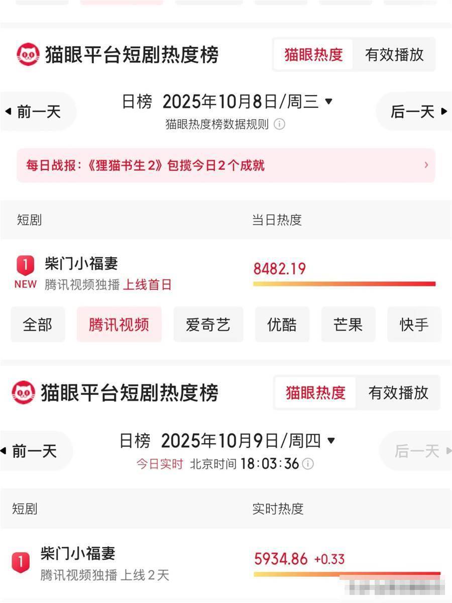 《柴門小福妻》開播首日8482萬,登頂騰訊視訊貓眼平台短劇熱度榜第一,連續兩天登頂榜首。