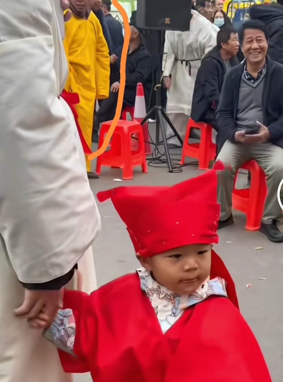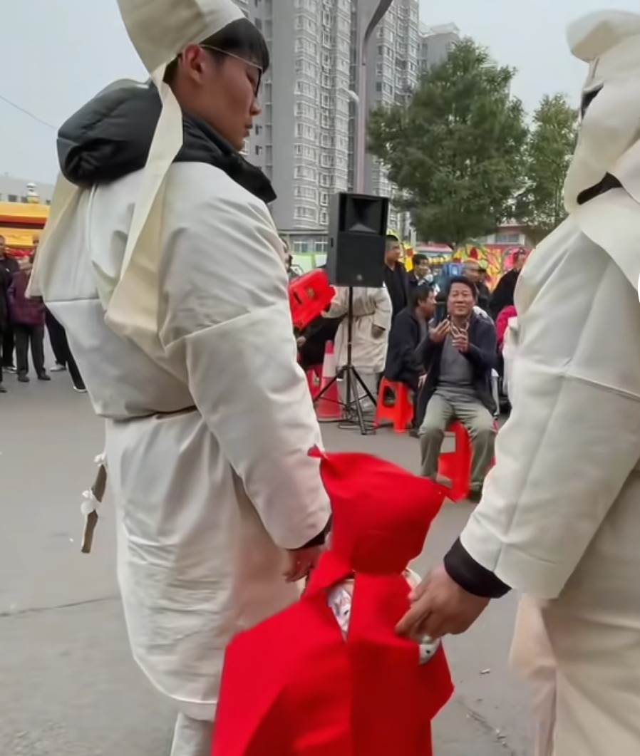 然而,在穿孝服的人群中,出現了一些不同尋常的景象。除了常見的白色孝服外,還有一些人穿著黃色和紅色的孝服,特別是一個小孩穿著紅色的孝服,顯得格外顯眼。這種顏色的孝服在傳統葬禮中并不常見,引起了一些人的好奇和不解。