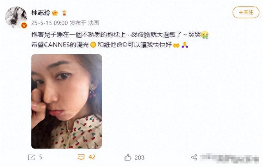 最有意思的是,她在社交媒體上還發了個小「牢騷」,說自己抱著寶貝兒子睡酒店的枕頭,結果臉蛋給過敏了,還配了個經典的嘟嘴「哭哭」表情。