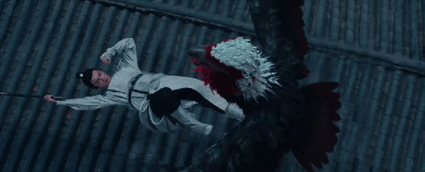 盧凌風依然不懼,從天上打到屋頂,索性以屋頂為跳板,縱身一躍,一槍擊向鳥頭。