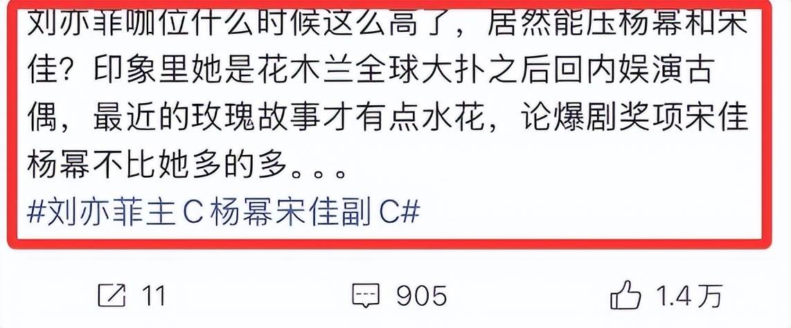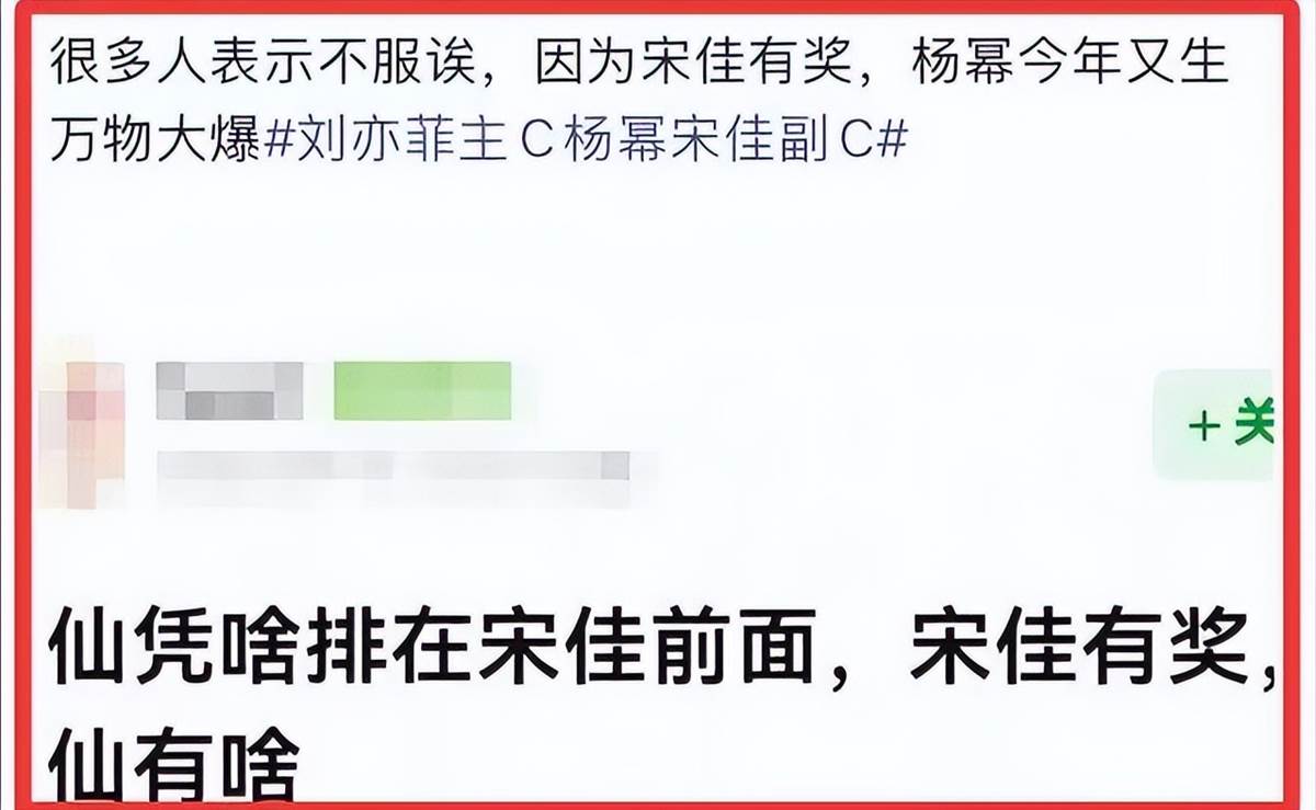 要知道宋佳最近可是剛二封白玉蘭、楊冪也憑借《生萬物》大獲好評,相比之下劉亦菲反而沒什麼動靜,這個時候她站C位,難免讓很多網友覺得「德不配位」。