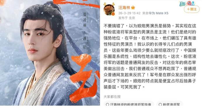 張凌赫被酸「粉底液將軍」。 還有網民翻出《楚漢傳奇》飾演項羽的何潤東造型,認為何潤東血塵滿臉的樣子才是「將軍天花板」,對此有不少粉絲抗議,認為古裝偶像劇本來就有浪漫、美化的成分,把影視劇升級到意識形態層面要求寫實,實在過于嚴苛,然而《楚漢傳奇》的編劇汪海林在微博發文反擊,「看見粉圈在圍攻鈞正平,為了維護粉底液將軍,也是活久見」。