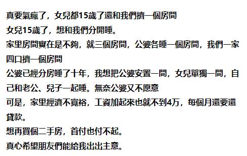 真要氣瘋了,女兒都15歲了還和我們擠一個房間女兒15歲了,想和我們分開睡。家里房間實在是不夠,就三個房間,公婆各睡一個房間,我們一家四口擠一個房間公婆已經分房睡了十年,我想把公婆安置一間,女兒單獨一間,自己和老公、兒子一起睡。無奈公婆又不愿意可是,家里經濟不寬裕,工資加起來也就不到4萬,每個月還要還貸款。想再買個二手房,首付也付不起。真心希望朋友們能給我出出主意。