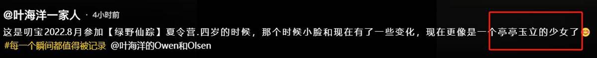 沒想到葉海洋隔了一天在另一個賬號上側面回應了女兒發育的事情,她發了一條大女兒四歲時的照片合集,并配文「那個時候小臉和現在有了一些變化,現在更像是這個亭亭玉立的少女了」。