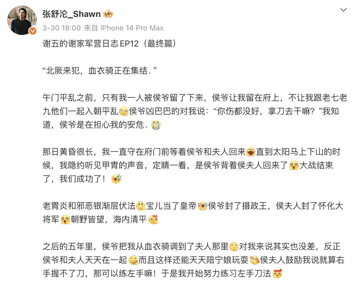 熱血古裝劇《逐玉》日前迎來大結局,除了「言長夫婦」樊長玉與謝徵重回林安、回歸市井生活的圓滿收尾,飾演謝徵忠誠侍衛「謝五」的演員張舒淪,在微博發布的「謝家軍營日誌」最終章,更成為戲外最大的「售後驚喜」。