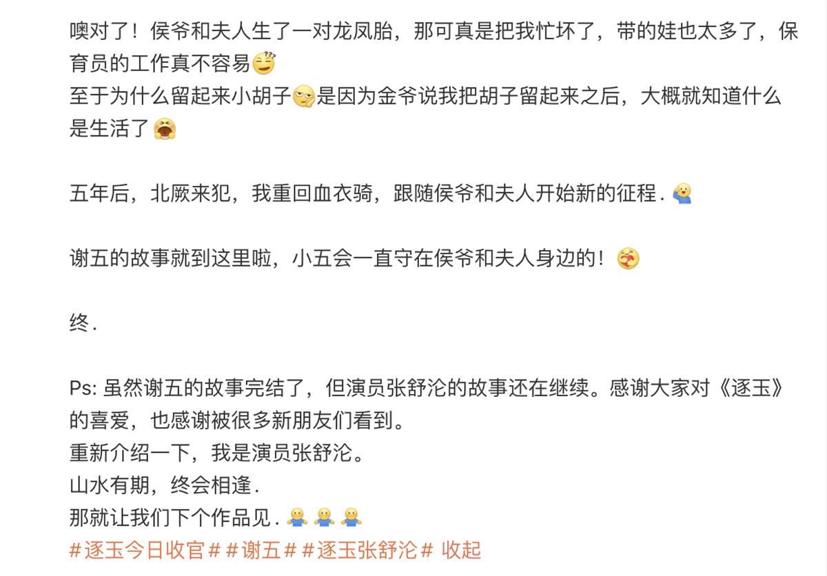 田曦薇、張凌赫主演的熱血古裝劇《逐玉》,在男女主角在歷經滅門血仇與亂世戰火後,最終選擇卸下戰袍,回到最初相遇的林安鎮重開肉舖,實現「你殺豬,我養你」的承諾。然而,結局中一筆帶過的「五年後育有龍鳳胎」幸福生活,卻在「謝五」張舒淪的微博日誌中得到了最鮮活的「番外視角」。