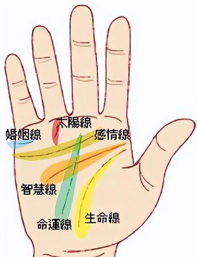 第五、婚姻線,在小指下邊,而處于感情線上面的紋路,只要我們側著看,就能看到。它所代表的,是人們的婚姻關係。