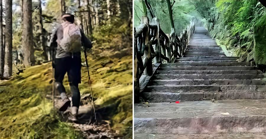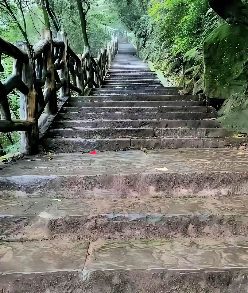 我最近被一張山間樓梯的照片迷住了,更準確地說,是被它帶來的困惑迷住了。照片裡,一段古樸的石階在林木與山霧間蜿蜒,一側是深褐色的木質護欄,另一側是覆滿青苔的陡峭山壁。我將它發到網上,問了幾十個朋友一個看似簡單的問題:「你覺得這是上山的樓梯,還是下山的?」