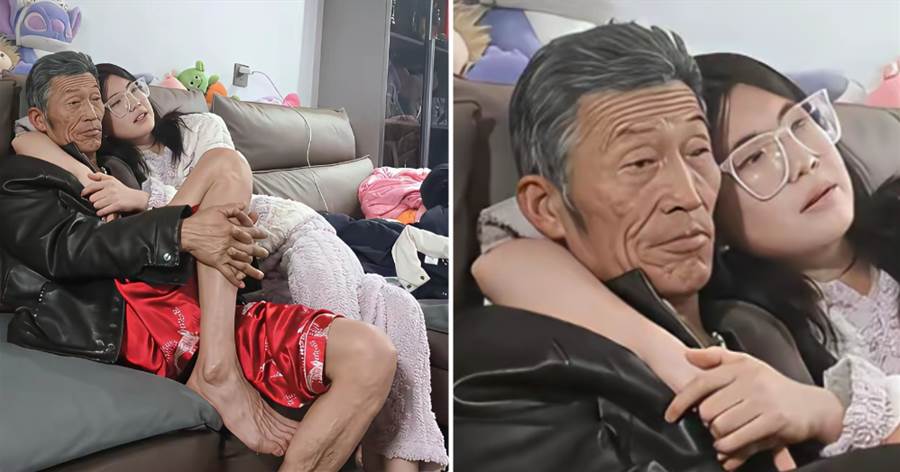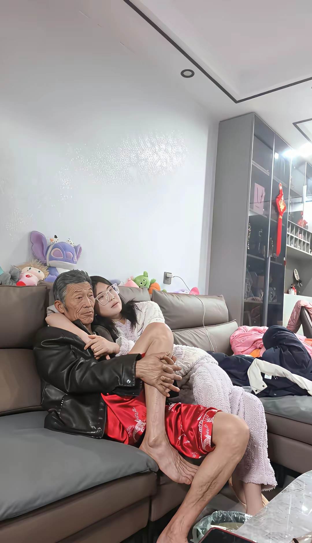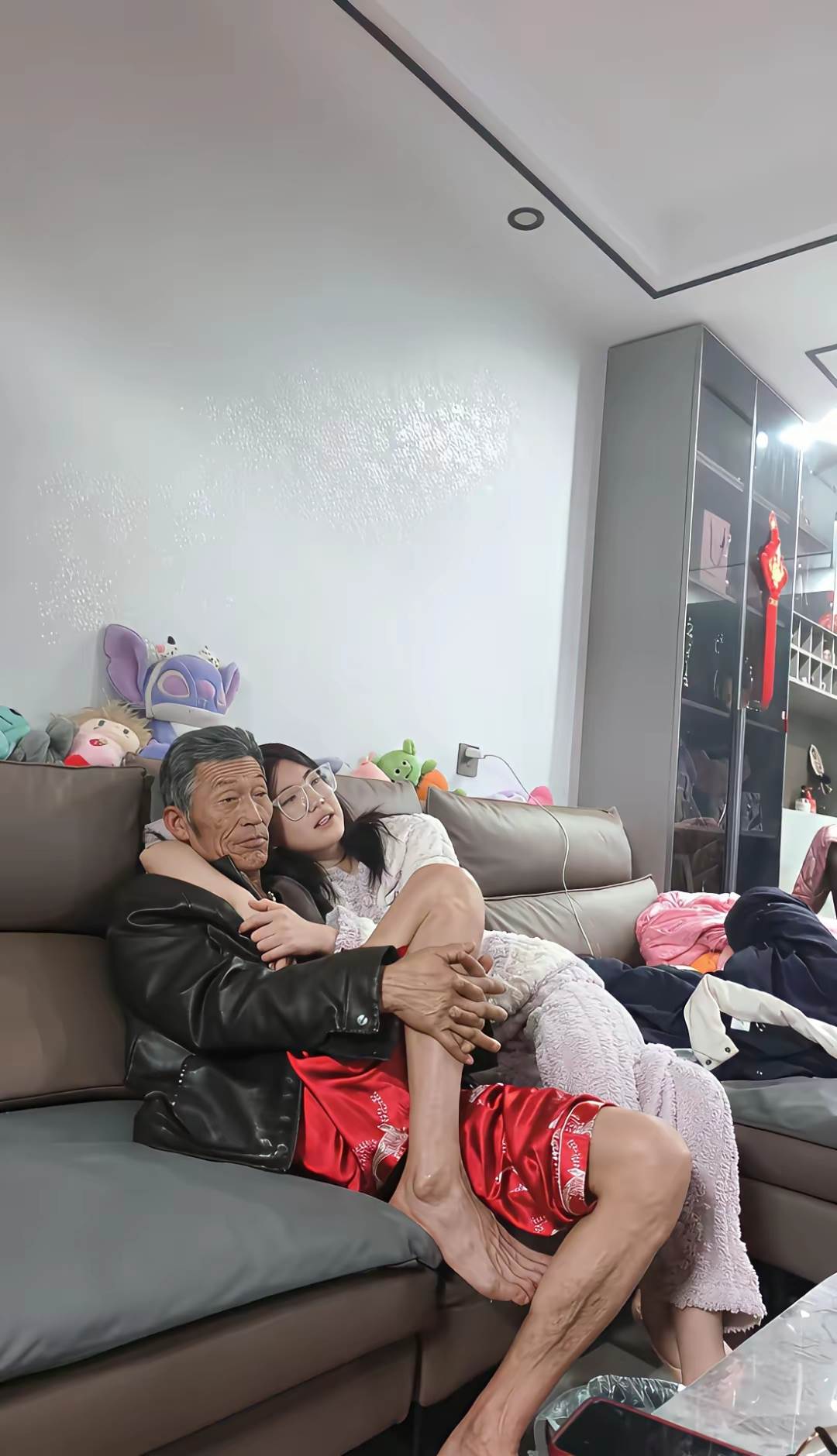 這張照片在社交平臺上引發了始料未及的熱議。畫面定格在一個溫馨的居家瞬間:一位年輕女性身著舒適的淺色毛衣和毛絨長褲,赤著雙腳,以全然放鬆的姿態依偎在爺爺懷裡。她的頭輕輕靠在爺爺肩膀上,雙手交疊放在身前,面容安詳。爺爺則穿著黑色皮夾克和紅色短褲,同樣赤腳,左手輕輕握著孫女的手腕,右手自然搭在一旁,神情慈祥而滿足。兩人身體緊貼,坐在淺灰色的L型沙發上,背景是點綴著裝飾燈的白牆,一側堆放著史迪奇等毛絨玩具,另一側是置物高櫃,頂部懸掛著中國結。地面散落的衣物和柔和的燈光,共同勾勒出一個真實、不設防的家庭生活場景。