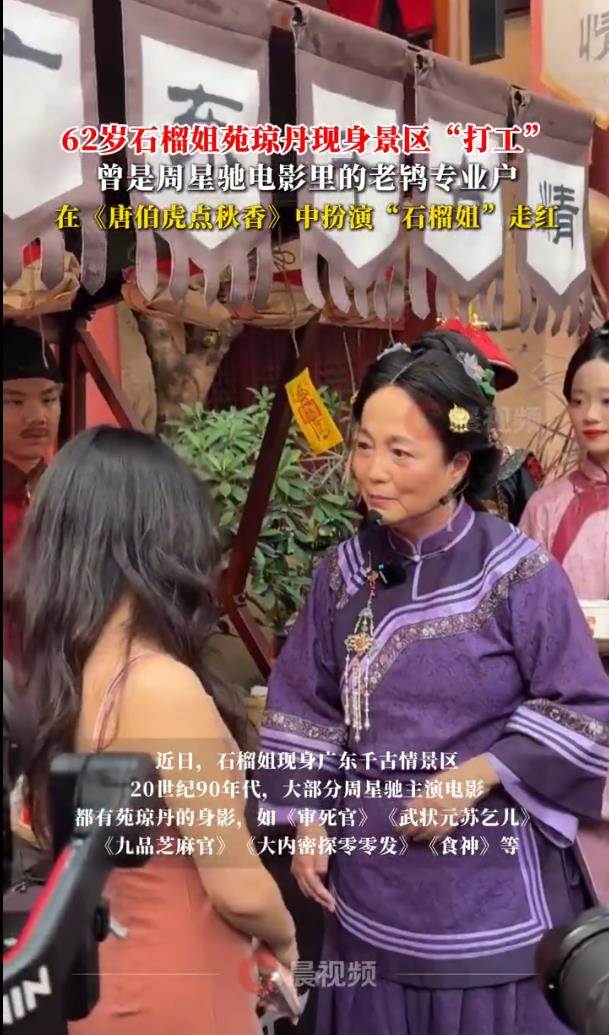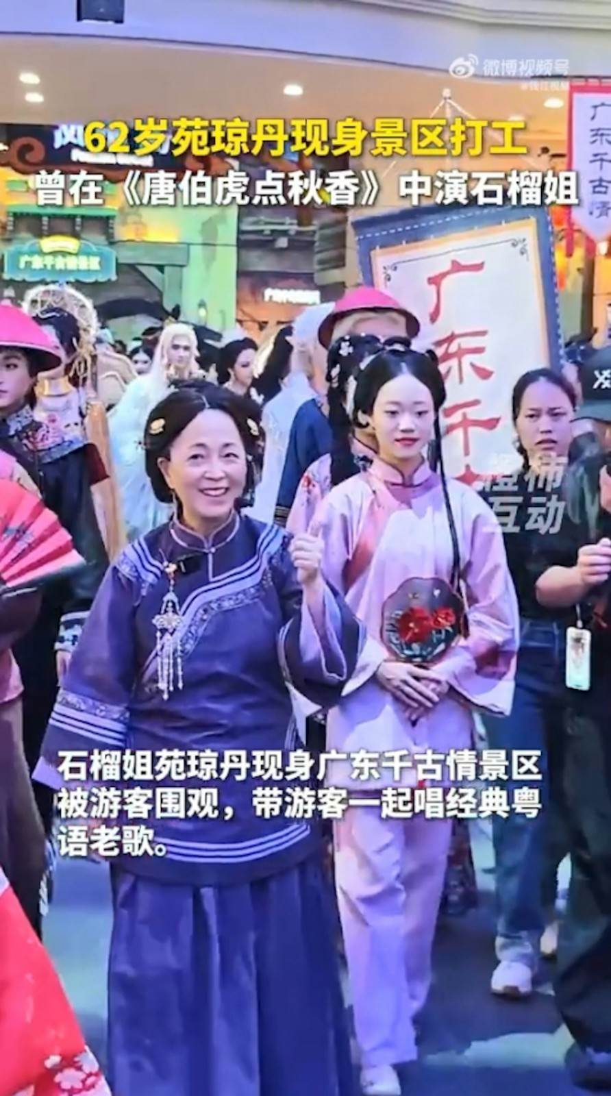 62歲香港演員苑瓊丹于1983年出道,曾演過多部周星馳參與的電影,其中又以《唐伯虎點秋香》石榴姐角色最為經典。怎料知名度相當高的她,近日卻被目擊現身廣東千古情景區,帶領遊客合唱經典粵語老歌,意外引發熱烈討論。