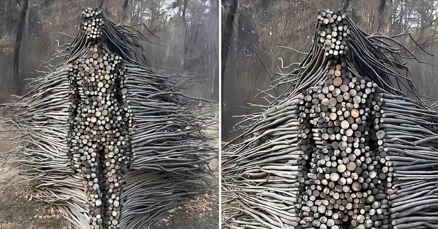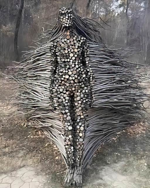 樹林深處突然竄出一頭「巨獸」!枯木亂枝交織成龐大軀體,粗壯的「四肢」撐在乾裂的土地上,滿是節瘤的「軀幹」由無數截短木頭緊密堆疊,細長的枝椏如鬃毛般向四周炸開,遠看就像一頭從森林深處甦醒的野獸,讓偶然闖入的路人嚇得腳步一滯,以為撞見了什麼神秘生物。