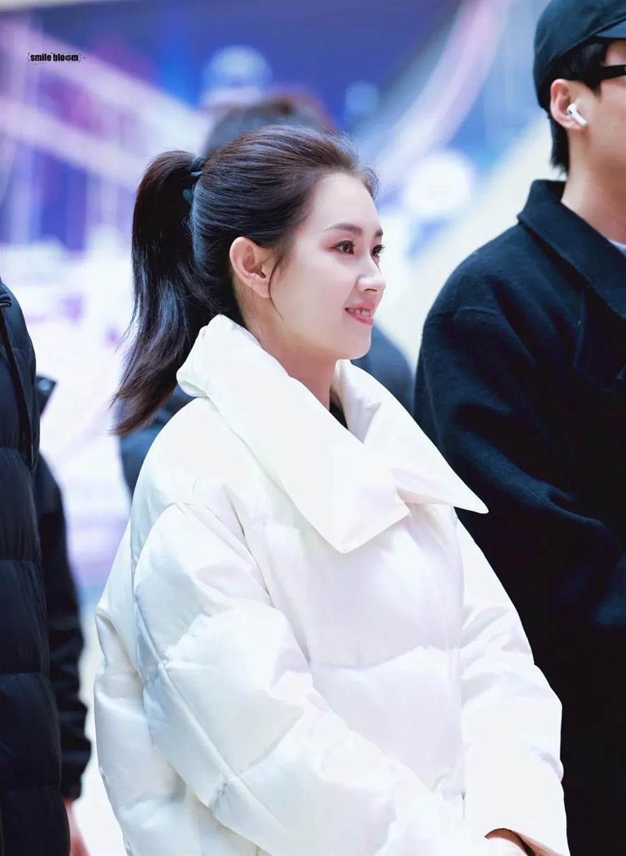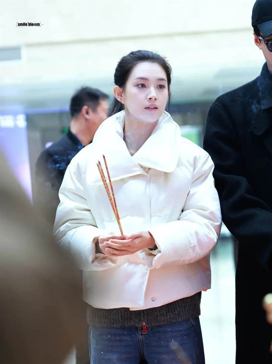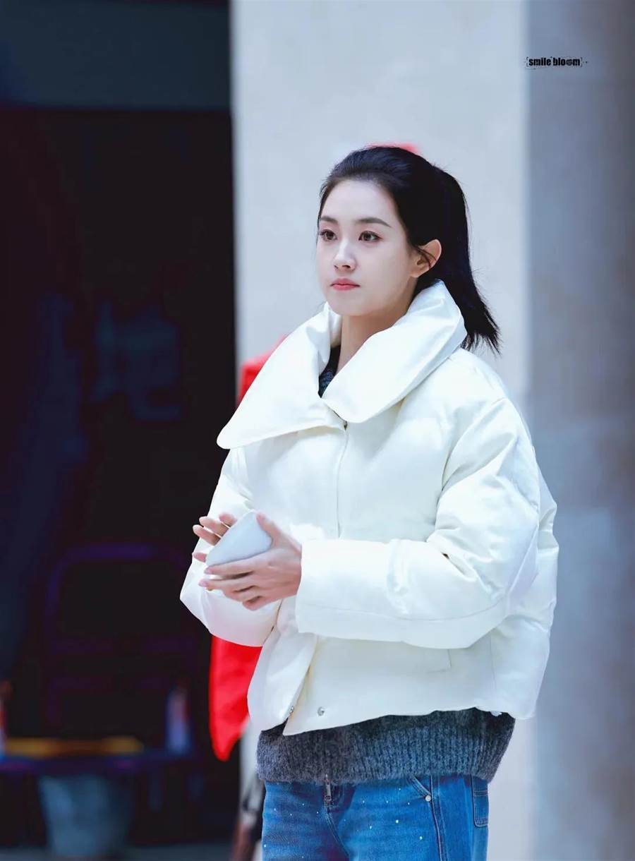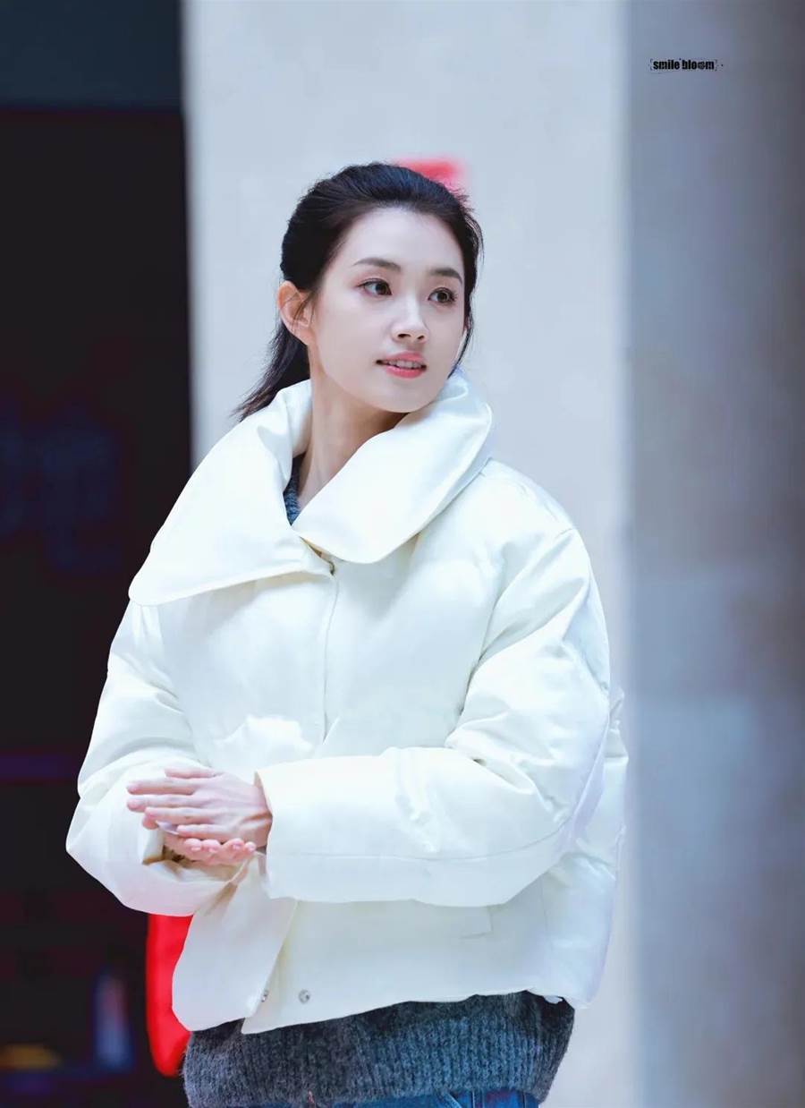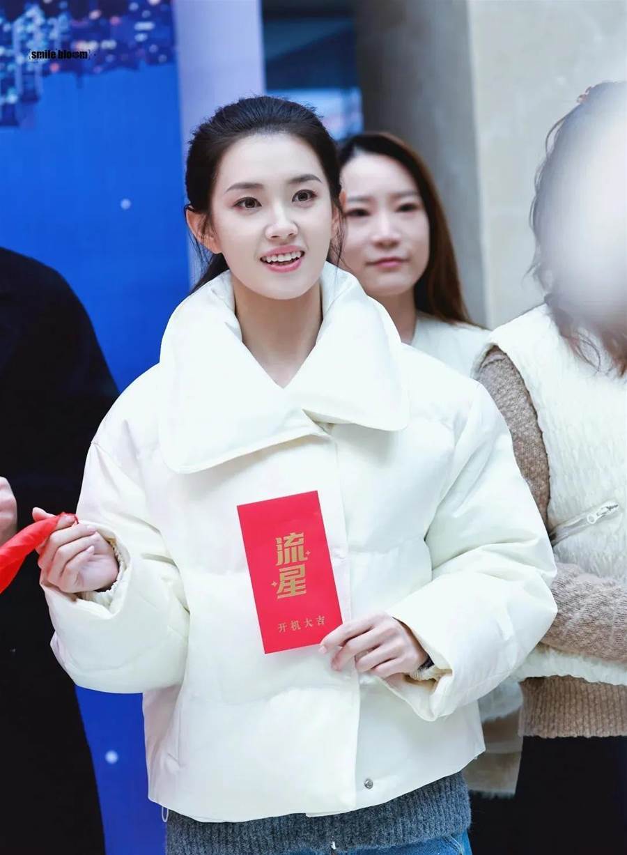 在開機儀式上,郭宇欣素顏出鏡,頭髮紮成高馬尾,顯得清爽利落,上身穿著寬鬆的白色羽絨服,搭配淺藍色牛仔褲和黑色運動鞋,整體造型休閒舒適,充滿了青春活力。