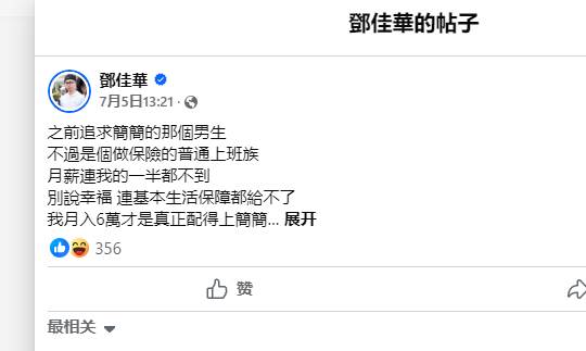 鄧佳華近日發文指出,簡簡過去曾被一位從事保險業的男子追求,但他認為對方收入不高,「連我的一半都不到」,難以提供穩定生活保障。他直言,自己每月收入達6萬元,才是真正配得上簡簡,能讓簡簡過好日子的人,「簡簡不是隨便誰都能擁有的。