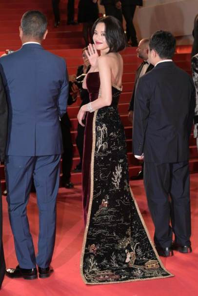 法國坎城電影宮前的紅毯上星光璀璨。作為本屆坎城電影節主競賽單元評委的舒淇壓軸亮相,一襲暗夜藍絲絨曳地禮服瞬間成為全球媒體焦點。而當她轉身的瞬間,禮服背後徐徐展開的《千里江山圖》刺繡長卷,更是將東方美學的恢弘與浪漫推向[高·潮]。這場跨越千年的文化對話,讓舒淇成為當晚當之無愧的「紅毯封神」人物。