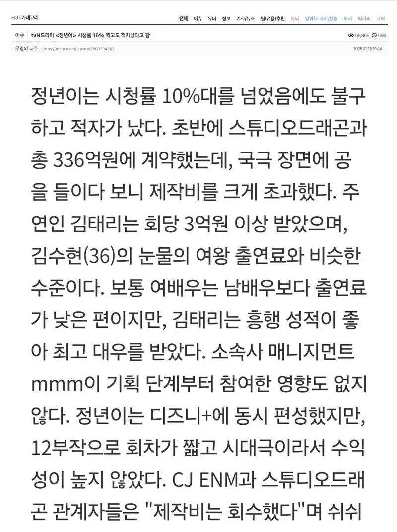 事實上,《正年》金泰梨的經紀公司Management MMM從企劃階段就參與其中,因此多少也會對片酬產生一定影響,再加上《正年》雖然同步在Disney+上播出,但由于僅有12集又時代劇所以收益性并不高。