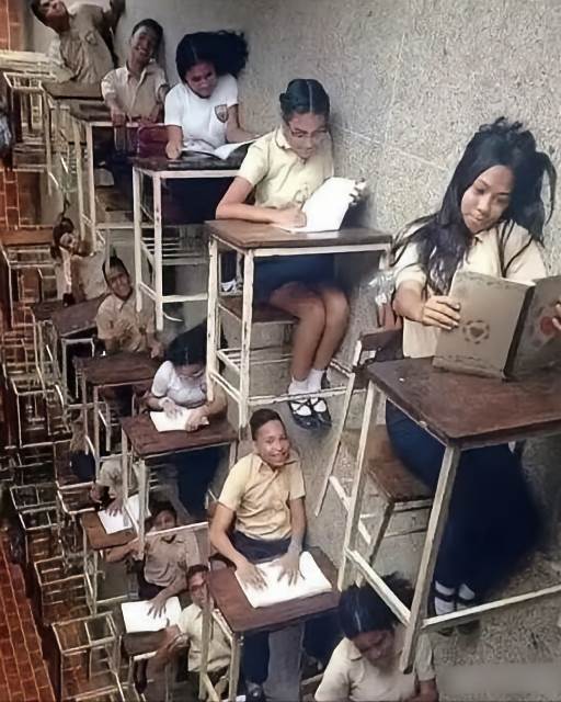 你能想象考試時,你的座位是懸在半空中的鐵架,旁邊同學的桌子就在你頭頂,而你要踮著腳才能把答案寫在紙上嗎?最近一張來自東南亞某國中學的考場照片在網上瘋傳,畫面中數十張課桌椅被層層疊疊地堆疊在狹小的走廊裡,學生們像螞蟻一樣擠在各個「樓層」,有的坐在最高處埋頭寫字,有的則蜷縮在最底層的角落,整個場景宛如一座垂直迷宮,讓人不禁懷疑:在這樣的環境下,學生們真的能專心考試嗎?