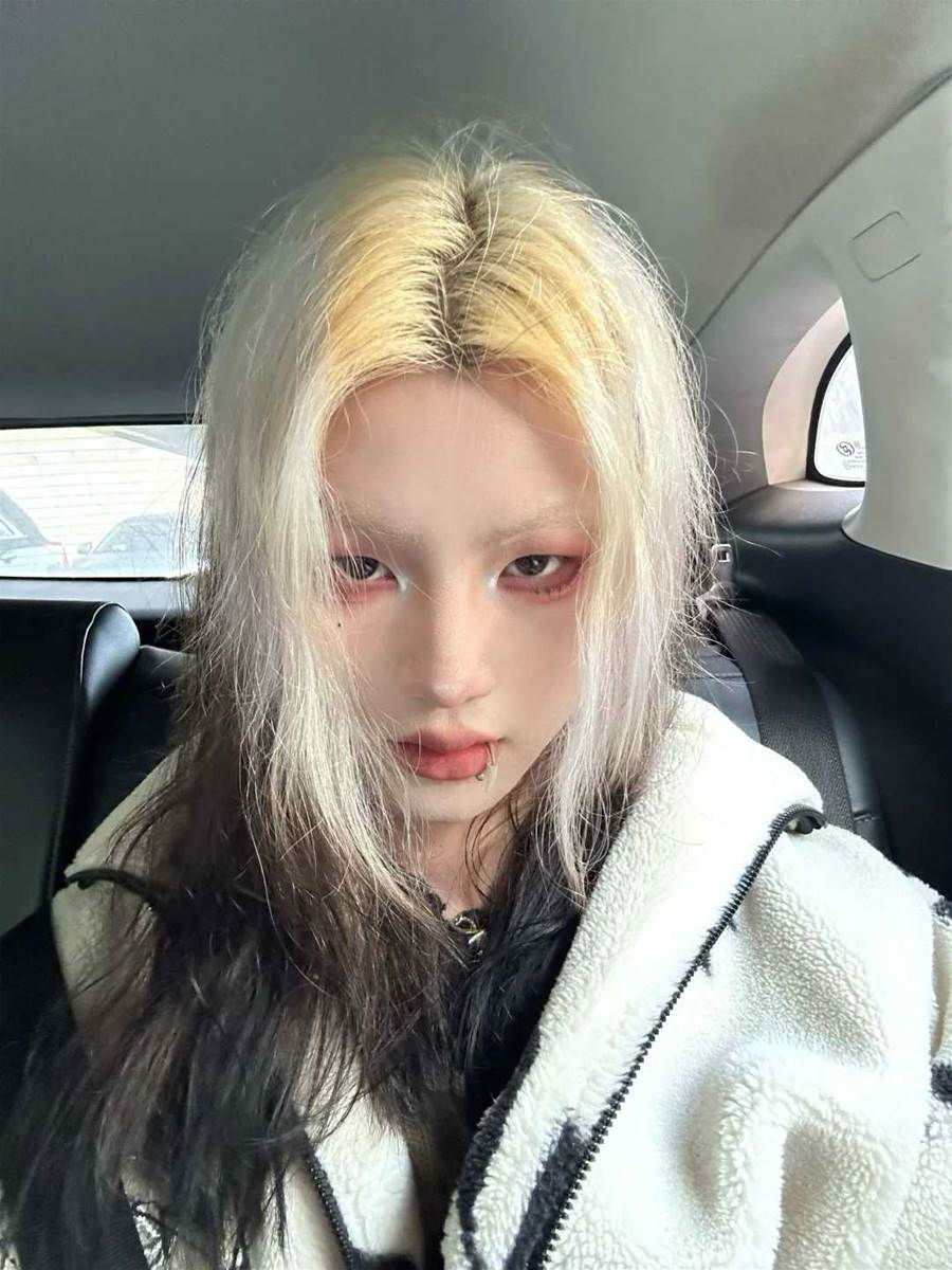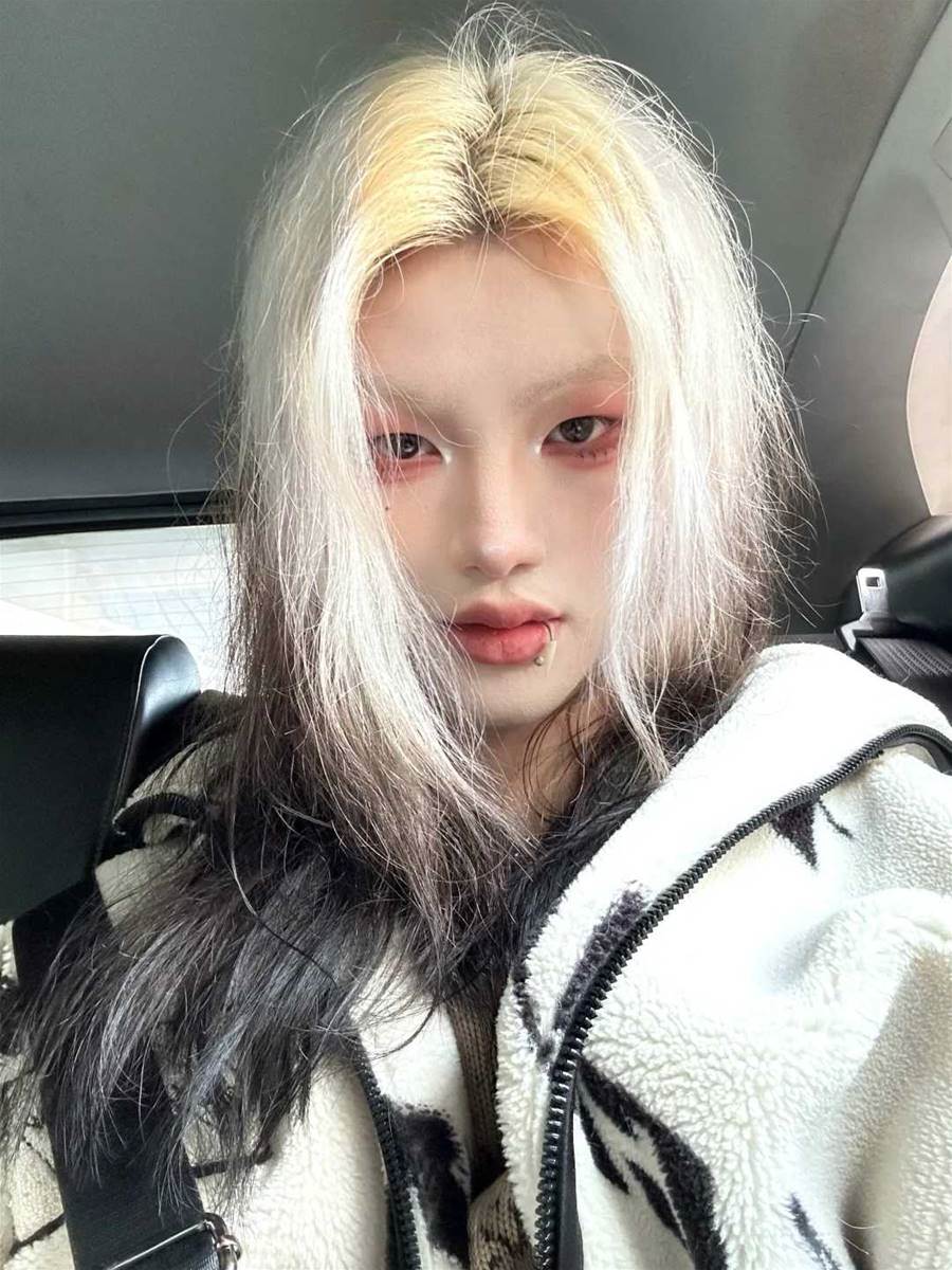 然而,4年后再看,現在的他讓人一時竟然認不出來——頭髮染成了漂白和黑色漸變的風格,眉毛是淺色系,臉上化著濃濃的妝,還佩戴了唇釘,整個人的風格看起來非常接近動漫里的二次元角色。他的眼神也從以前的自信陽光,變成了深沉憂郁,甚至透著幾分厭世的味道。