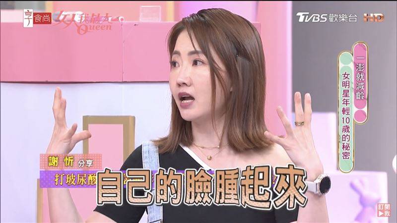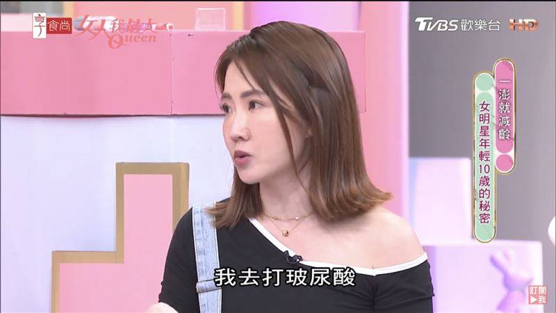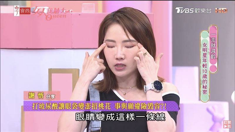 她透露曾整型時,主持人藍心湄完全不敢置信,因為絲毫看不出人工痕跡。她則指出,因為自己已有年紀,希望能擁有「招桃花」的臥蠶眼,因此選擇打玻尿酸強化該處。結果在施打後僅半小時,她的臉竟腫得像豬頭一樣,眼睛也因腫脹瞇成一條線。她嚇得回電給診所詢問,醫生則認為這是「玻尿酸過敏」,要她回診所打降解酶。她直言,打完後臉部非常疼痛,且腫脹依舊持續3到5天,「連自己都認不出自己是誰」,工作也只能暫時擱置。