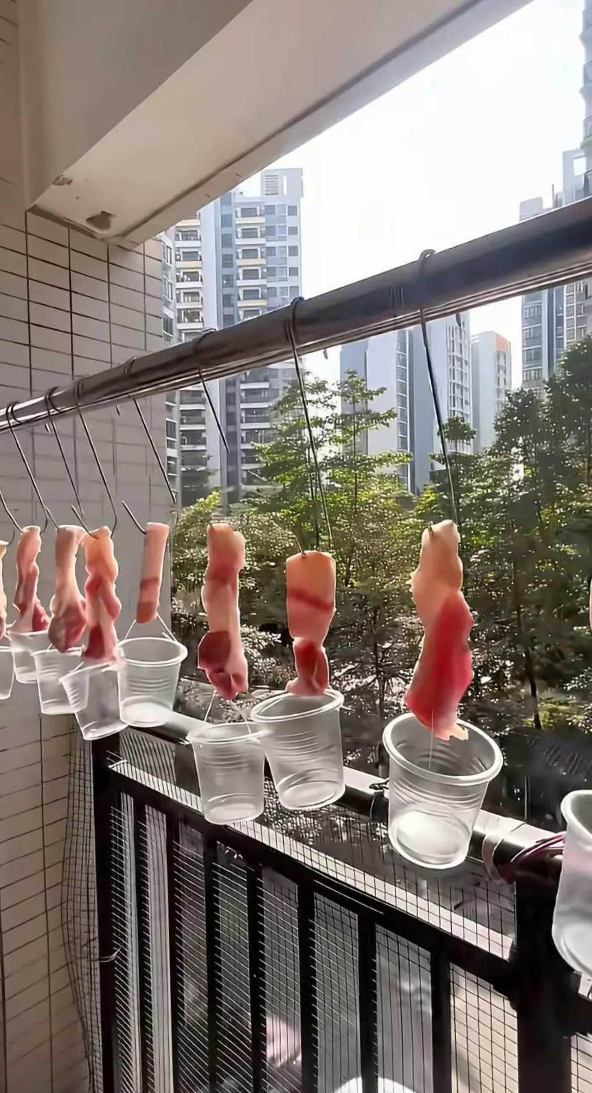 晾曬臘肉是南方人的冬季傳統,但現代城市居住環境已大不相同。有社群明令禁止陽臺晾曬臘肉,但婆婆選擇用塑料杯承接,既延續了傳統,又兼顧了鄰裡和諧。這種「土法創新」,展現了老一輩人在傳統與現代間的智慧平衡。