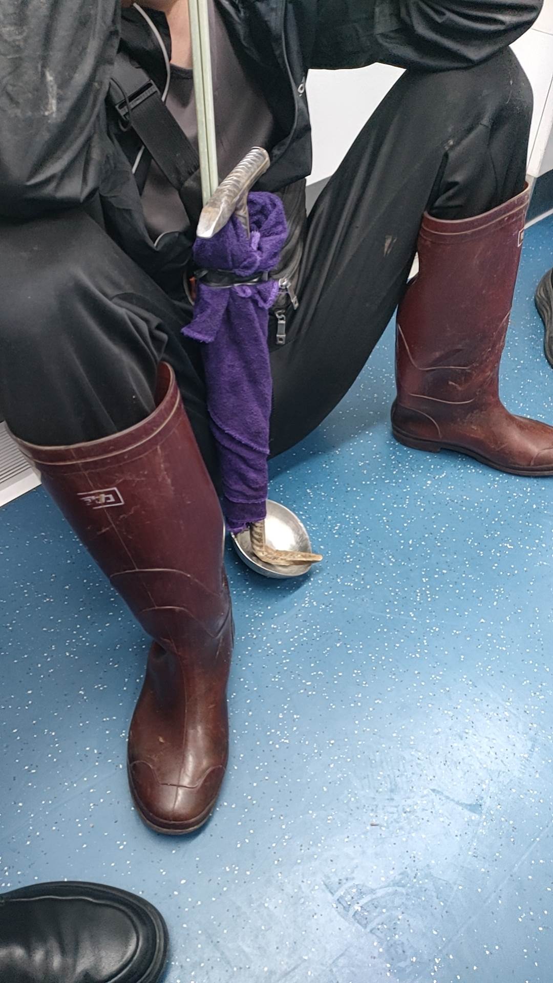 這位工作者穿著專業的工作服,腳上穿著一雙高筒靴,手中拿著一根長桿,桿的一端似乎連接著某種工具。這種裝扮和工具的組合,讓周圍的乘客感到好奇,紛紛猜測這位工作者的職業。