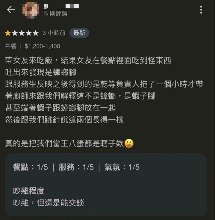 「真的是把我們當王八蛋瞎子誒」,男友氣到在桂田酒店_阿力海百匯餐廳Google留下一星負評,疑似吃到蟑螂腳的當事人,後續又再PO一篇還原過程,因不接受主廚「蟑螂腳及蝦腳」說法,最後副理承諾免單並將異物送驗,整件事情才結束;貼文在《Threads》上引發議論,甚至還有網友AI合成蝦身蟑螂腳照,「那家餐廳的蝦可能長這樣」、「他對一半,蟑螂就是陸地的蝦子,蝦子就是海裡的蟑螂」、「就沒見過哪隻蝦子腿上有毛的」。