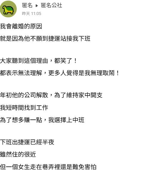 女網友回憶,今年初老公的公司解散,為了維持家中的開支,她迅速找到了一份工作、選擇上中班,為了多賺一些錢。然而,她每次下班出捷運已經半夜,雖然住的很近,但一個女生走在巷弄裡還是難免害怕,她多次要求老公接她下班,但每次都被拒絕,老公總是以「我要睡覺」、「我跟朋友約好上線」、「我很累」等理由推託。