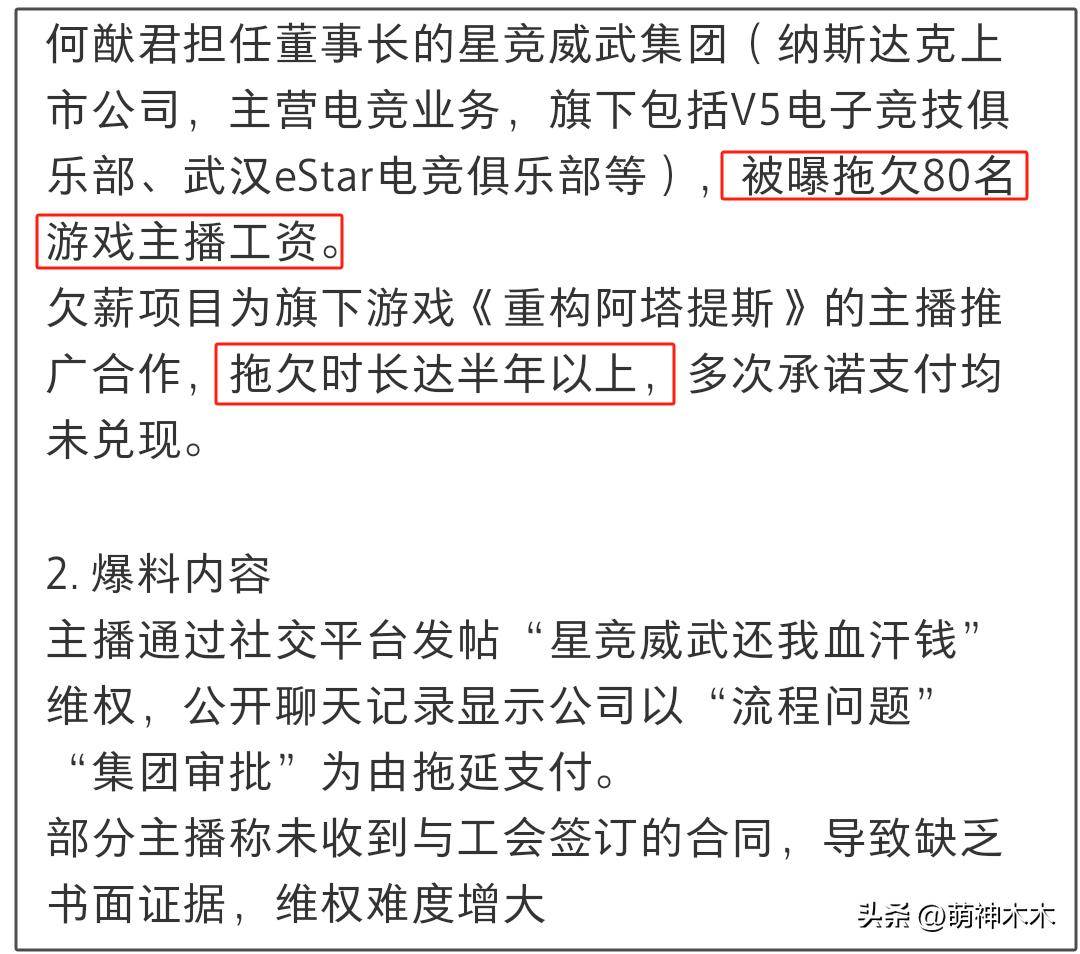 先來說欠薪風波,何猷君投資了電子競技公司,該公司在美上市后市值暴跌,有主播發文爆料稱何猷君拖欠游戲主播工資,人數多達80人,拖欠時長長達半年,而拖延的借口則是用「流程問題」、「集團審批」卡人。