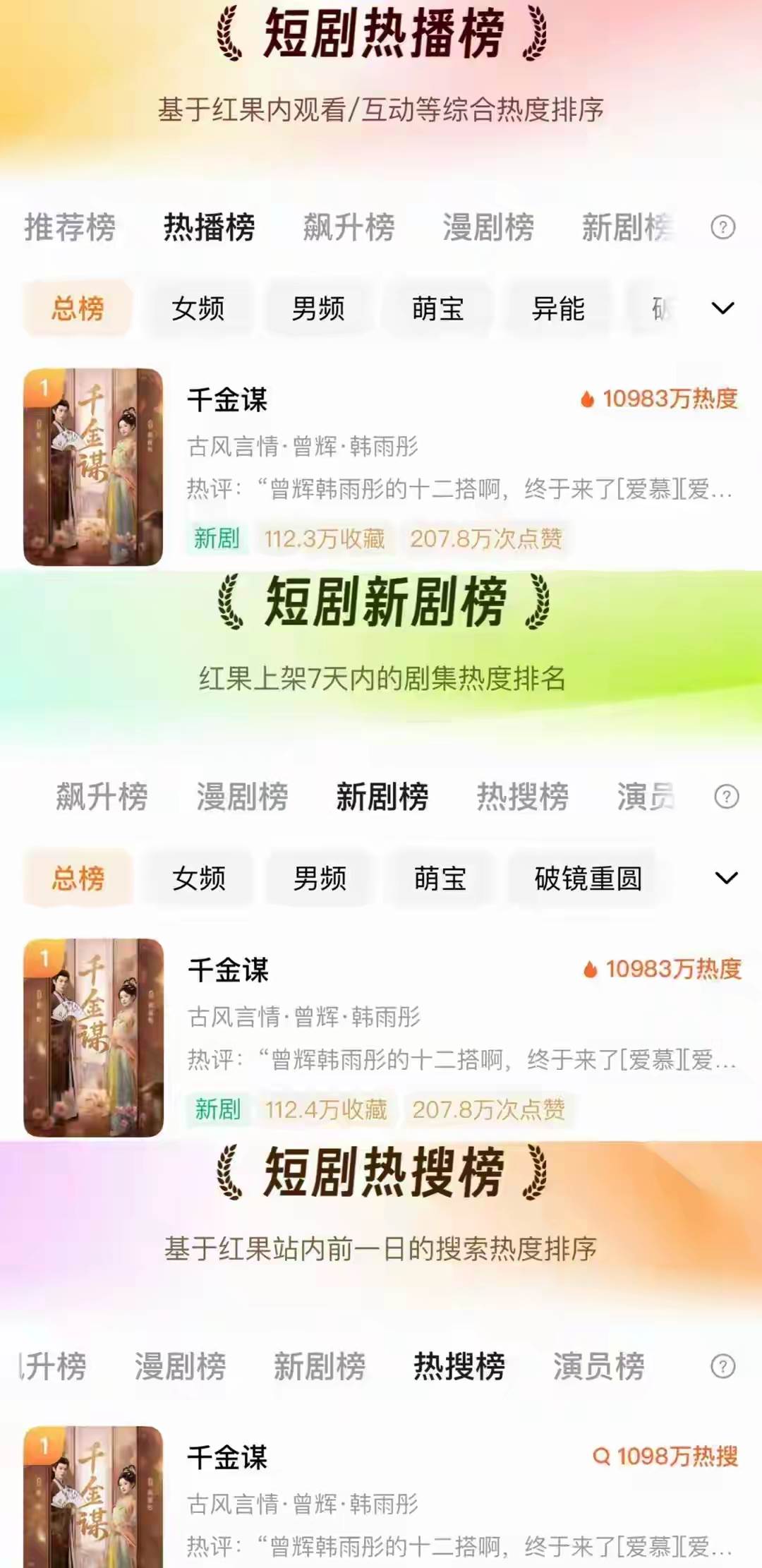 古裝劇迷最近徹底不用劇荒了!11月8號在紅果平台上線的短劇《千金謀》,剛開播就憑實力「炸屏」——首播熱度直接破億,全網相關話題量飆到五億,還一舉拿下古風言情類三大榜單冠軍,妥妥的「黑馬劇王」架勢。更讓人期待值拉滿的是,這部劇的主演是韓雨彤和曾輝這對「爆款制造機」,這已經是他們第十二次合作了,「落日雨輝CP」的粉絲早就盼到搓手,開播即爆完全在預料之中!