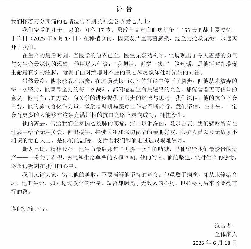盡管夏嘉憶擁有強大的求生本能,但經過了155天的艱難治療后,還是因為真菌感染,帶著自己尚未實現的愿望,永遠的離開了......