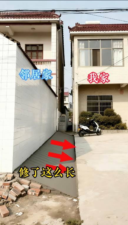 眼前的景象讓人窩火。我家和鄰居家之間那條原本平坦的公共過道,如今模樣大變。鄰居家趁我不在,用水泥在過道上砌起了一個長長的斜坡。這斜坡從他家牆根高高築起,然後一路傾斜而下,直直地指向、並最終低低地接入我家門前的地面。他家的門口因此顯得高高在上,而我家門口,則成了這個斜坡的最低點。圖片清晰顯示,一輛白色摩托車停在我家門口,而那個灰色的斜坡就像一道不懷好意的水流,蓄勢待發地要將一切衝向我的門前。