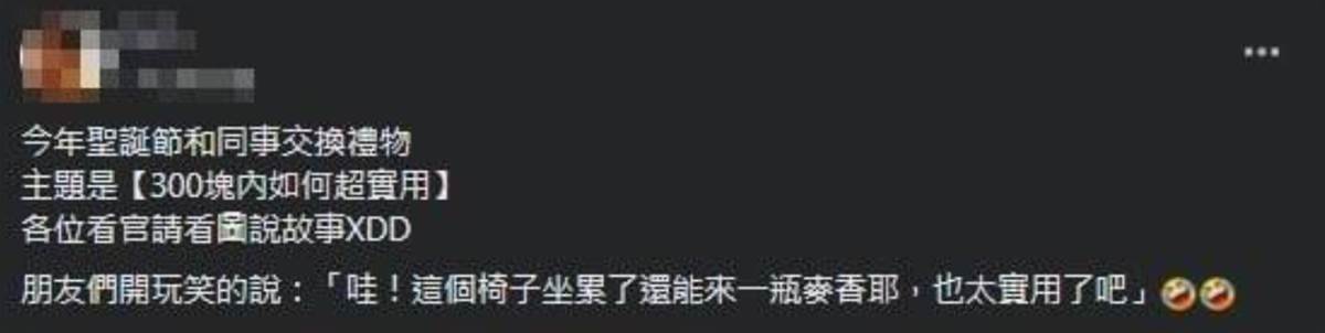 一位網友在「爆廢公社」分享自己在公司抽到的聖誕禮物,其中提到公司今年禮物主題是「300元內如何超實用」,很多同事都絞盡腦汁的用心準備,沒想到當天有人竟然拿了一張椅子過來,而原PO還很幸運的抽到!