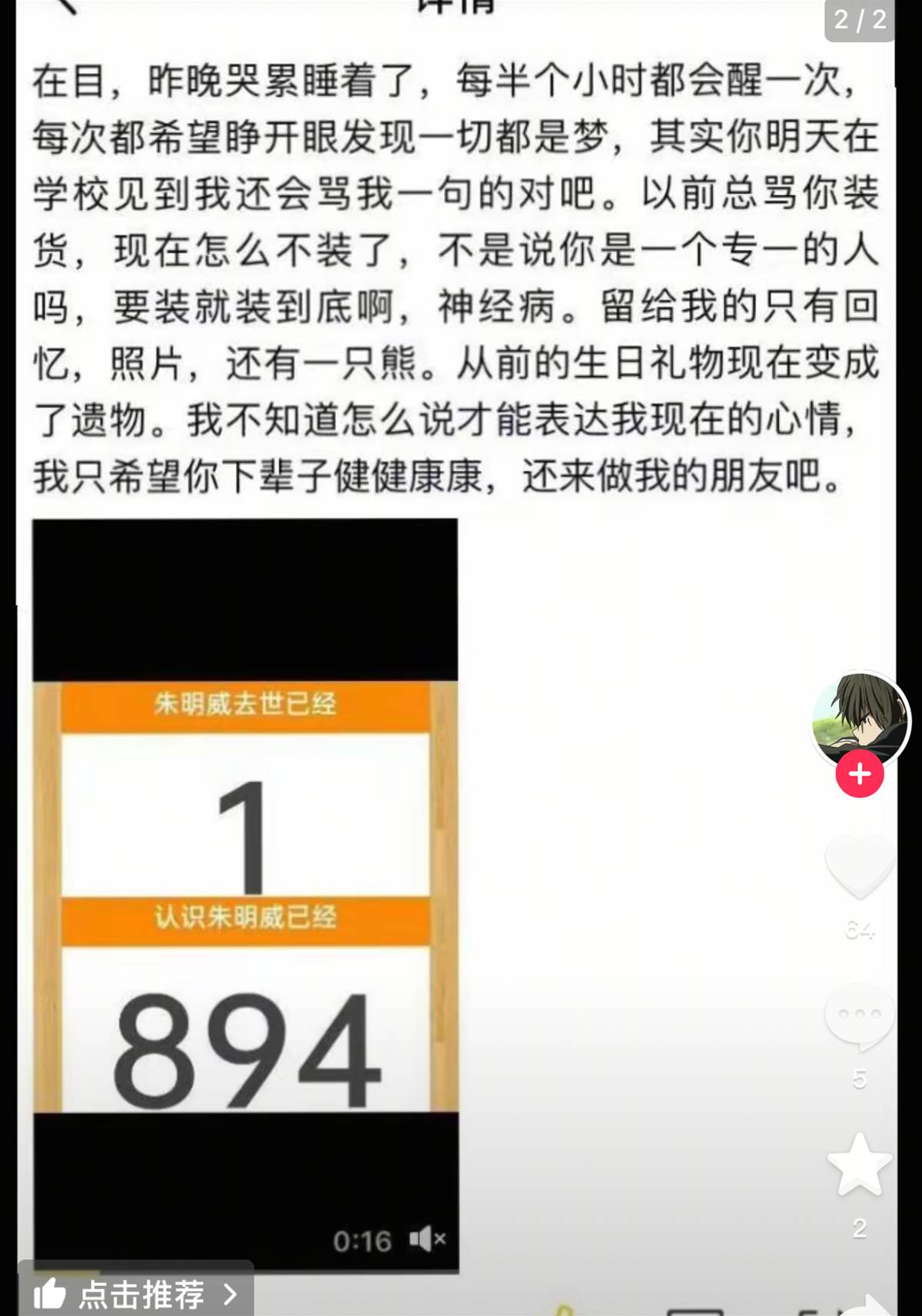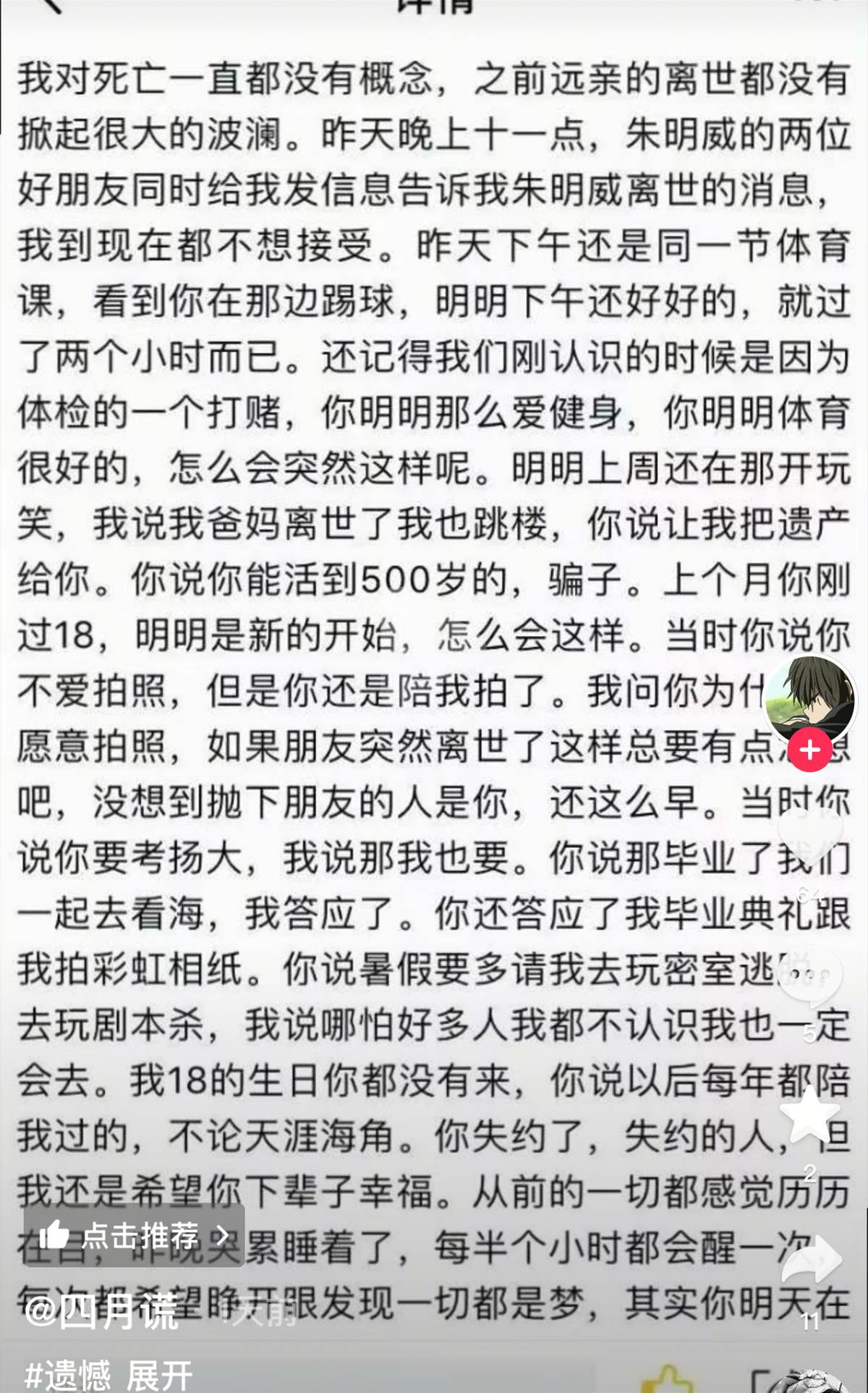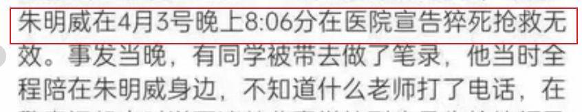 隨后又有網友發文,稱也是這件事的見證者,死者是朱明威,在南京市某中學就讀,他4月3日下午六點在操場和朋友們一起打球,前19分鐘狀態都很好,和朋友們說說笑笑好不熱鬧。
