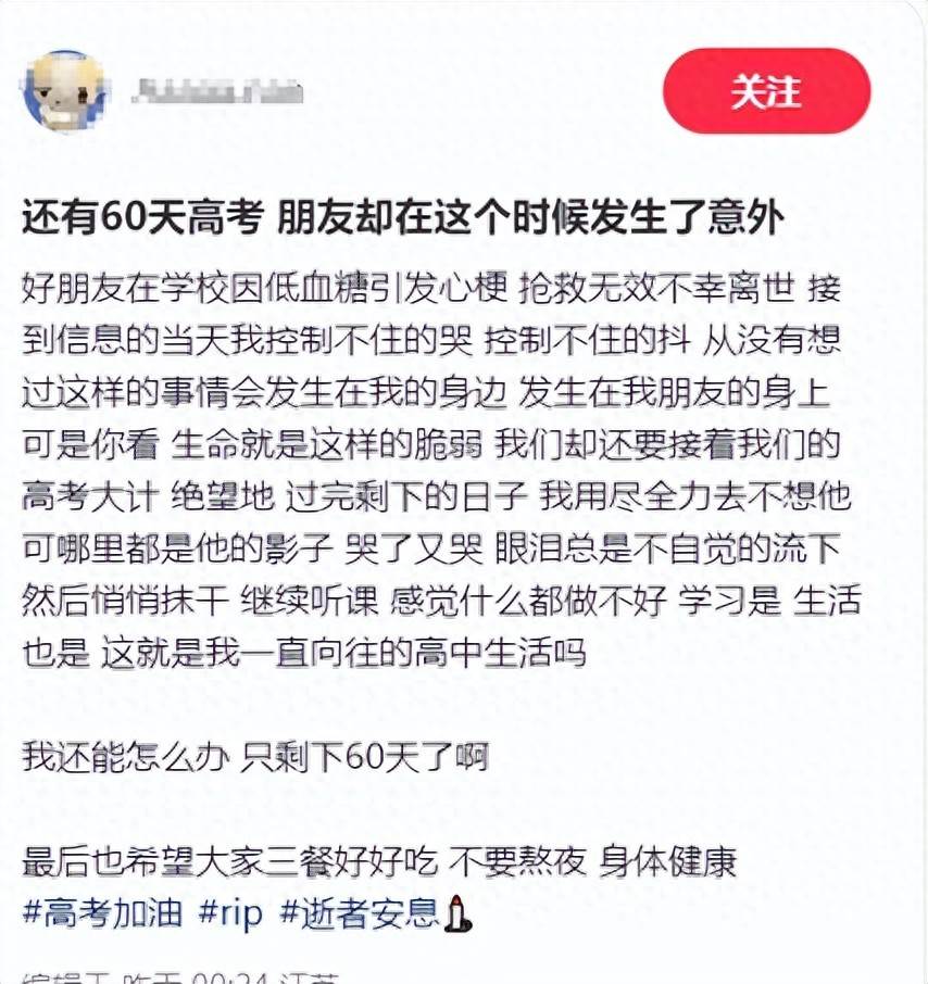 4月7日凌晨,有位江蘇南京ip的網友在社交平台發文悼念好友,言語中滿是悲痛,他提到自己的好友在學校里因低血糖引發心梗,搶救無效不幸離世。