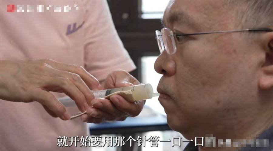助理在採訪中說,以前還能用勺子,現在只能靠針管,餵飯時要全程緊盯他的反應。