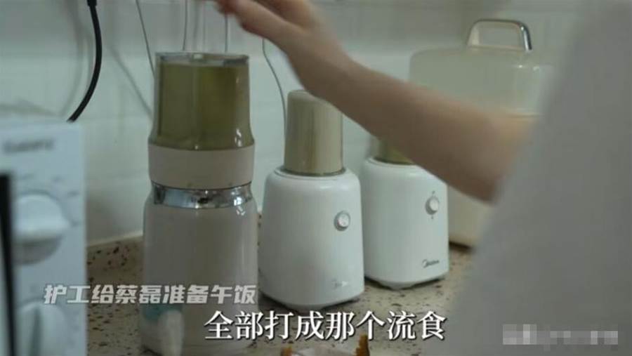 在前不久的採訪影片裡,護工正用針管給蔡磊喂加了增稠劑的流食。