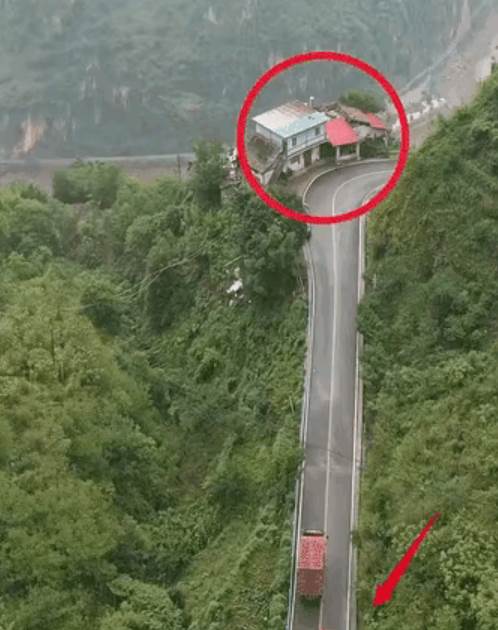 盤旋在群山之間的公路像一條灰白色的絲帶,纏繞在墨綠色的山體上。一側是陡峭巖壁,另一側是令人目眩的深谷。就在最險峻的彎道旁,一座白牆灰瓦的房屋孤零零地矗立著,被高空俯瞰的鏡頭用紅圈特意標出——它是這段長達十餘公裡山路中,唯一仍有人煙的住所。