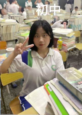 到了國中階段,她穿著校服,短髮清爽利落,臉上多了一份青春的靈動。