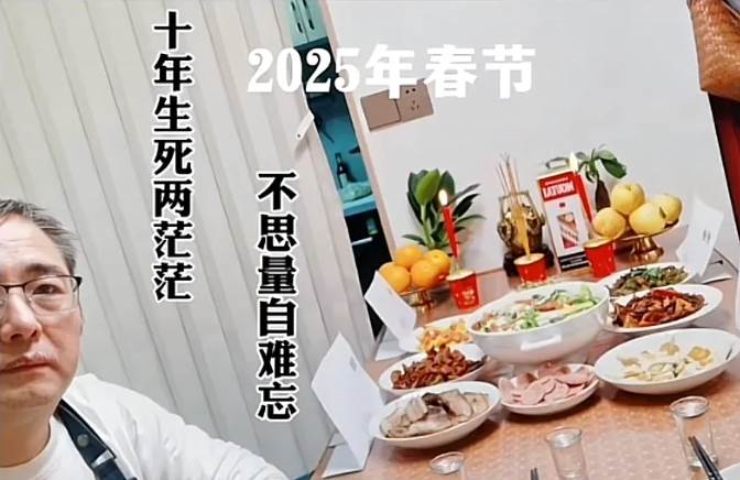 而在2025年的照片中,我們卻看到了截然不同的景象。照片中,只剩下了一位老人獨自坐在餐桌前,面前擺放著豐盛的年夜飯,桌子上卻只有已故老人用紙牌寫好的名字,顯得格外冷清。老人的臉上雖然帶著微笑,但眼神中卻流露出一絲難以掩飾的落寞。餐桌上的菜肴雖然豐富,但卻少了那份熱鬧和溫馨。照片的背景依然是那幢民居,但此時卻顯得格外空曠和寂靜。